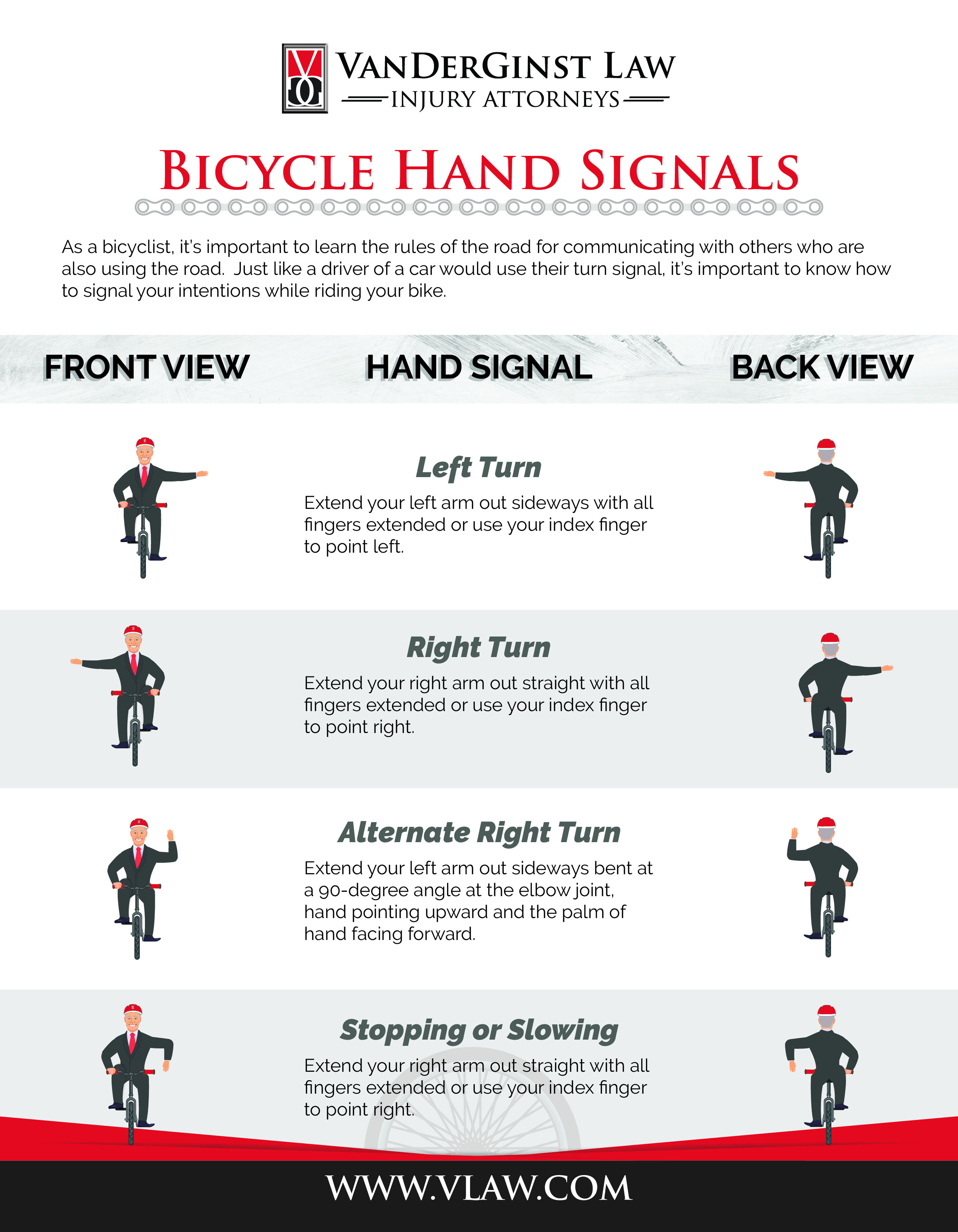“And since cyclists must obey the same rules of the road as motorists, proper hand signaling is another safety tool every cyclist must know,” says VanDerGinst.